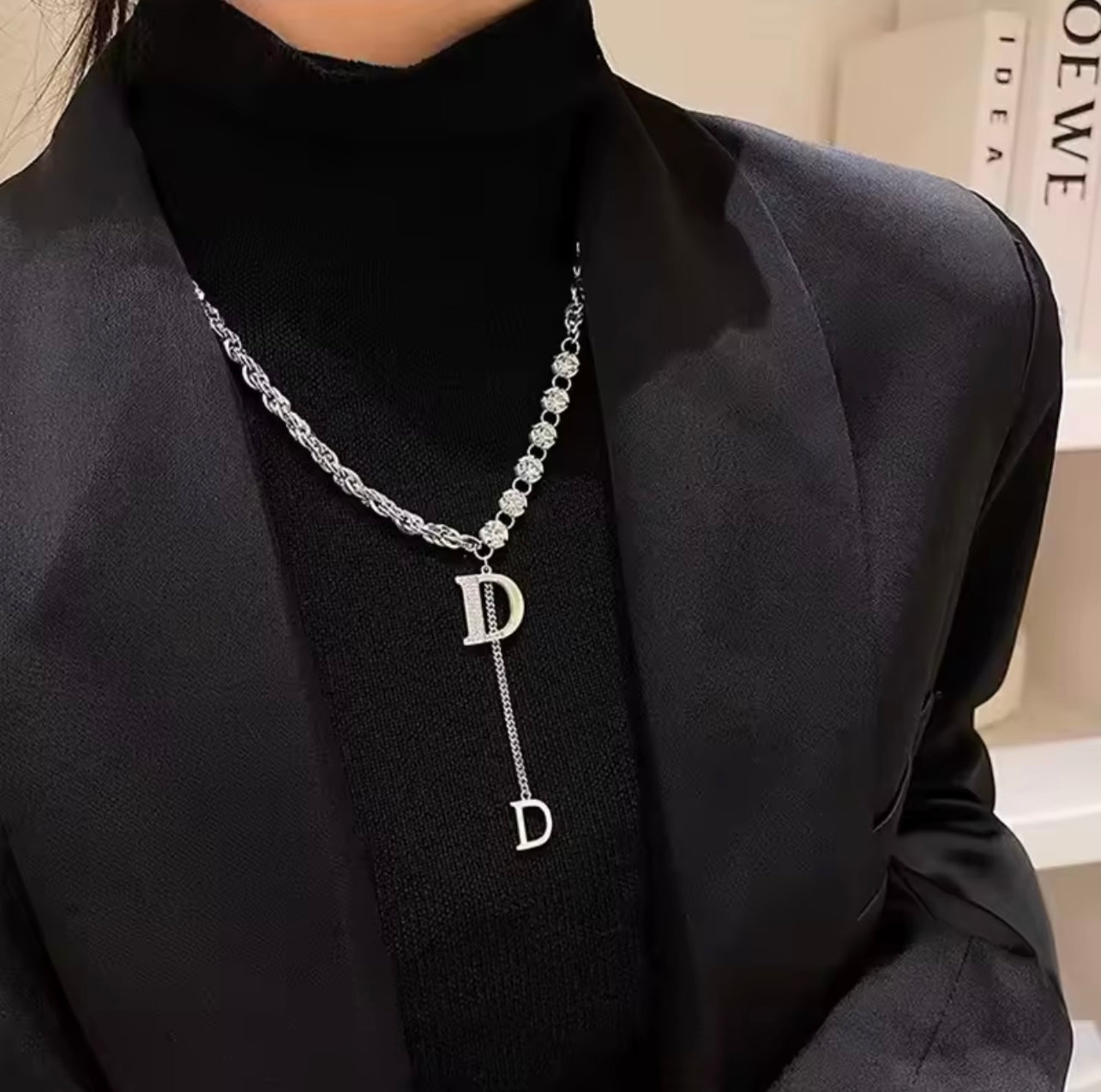 Die Kombination aus funkelnden Strasssteinen und den markanten Initial-D-Anhängern macht dieses Schmuckstück zu einem echten Hingucker – ob für elegante Abende, Partys oder als stilvolles Alltagsaccessoire.