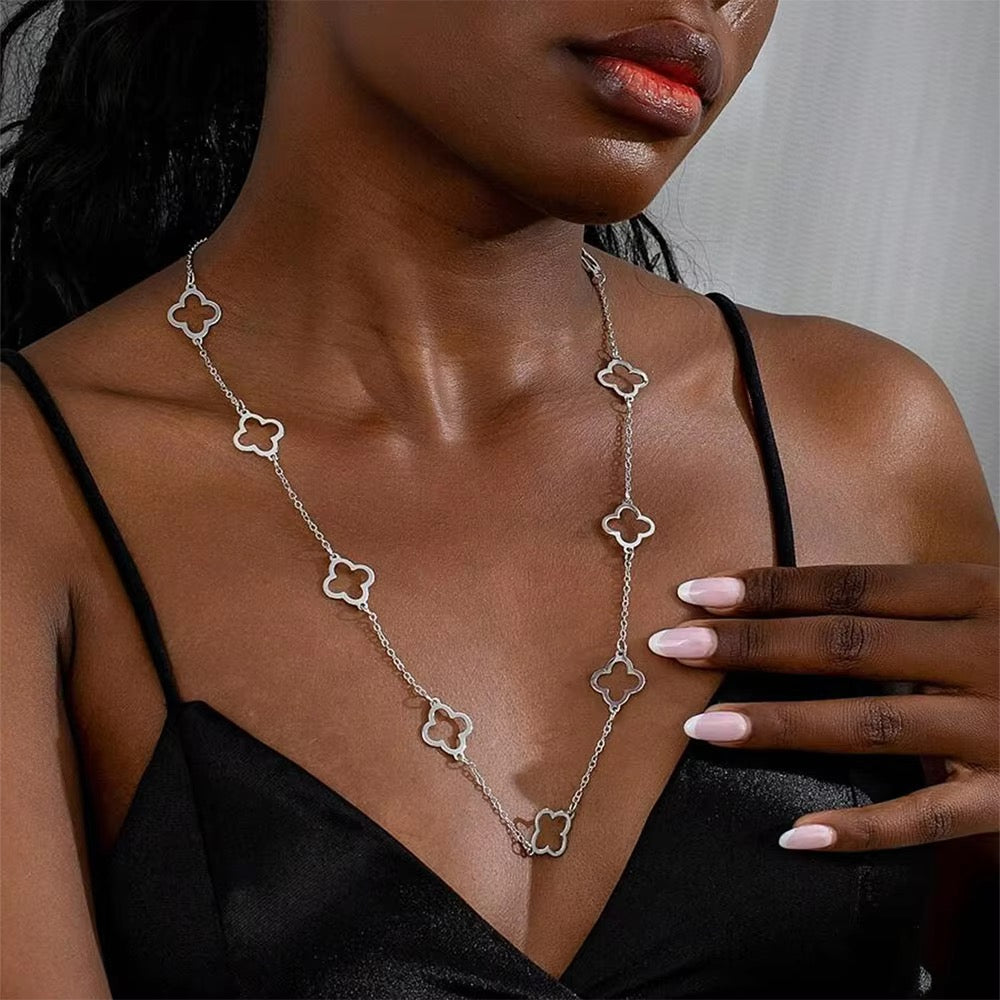 Bring ein bisschen Glück in deinen Look mit der Lucky Clover Halskette. Die zarten vierblättrigen Anhänger sind stilvoll über die gesamte Länge verteilt und verleihen jedem Outfit einen Hauch von Eleganz. Hochwertiger, goldfarbener Edelstahl sorgt für langlebigen Glanz, während das leichte Design angenehm zu tragen ist – perfekt für Alltag und besondere Momente.